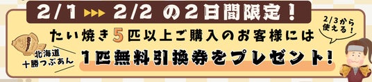 2月1日(土)・2日(日)の2日間限定で、たい焼き5匹以上ご購入のお客さまに、2月3日(月)