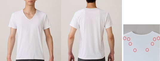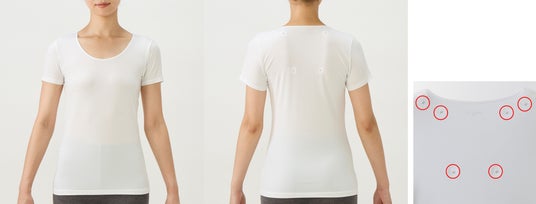 磁気は、体内成分に働きかけて、筋肉内の血行を良くし、「老廃物」を流すことでコリをほぐします。磁束密度100ミリテスラ※4)の磁石を、レディス3分袖とメンズ半袖Vネックは肩部と背中部に配置して肩から背中まで広い範囲のコリのケアを、レディス10分丈ボトムでは腰部に配置して腰の広い範囲のコリがケアできるようにしています。