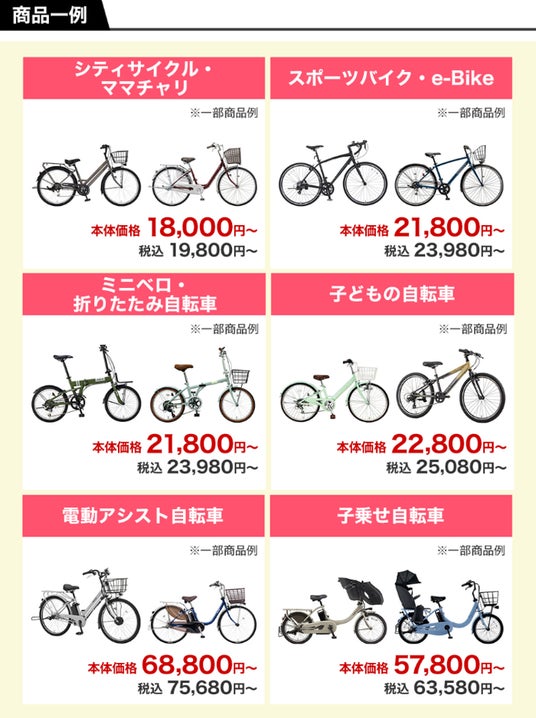 電動アシスト自転車やシティサイクル、スポーツバイク、ミニベロ(小径の自転車)・折りたたみ自転車、子乗せ自転車、キッズ・ジュニア向けの自転車など期間によって商品のラインナップは変わります。