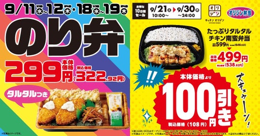 弁当・惣菜専門店「キッチンオリジン」「オリジン弁当」を展開しているイオングループのオリジン東秀株式会社(本社:東京都調布市/代表:後藤 雅之)は、9月11日(水)AM10時~12(木)と翌週9月18日(水)AM10時~19日(木)に「タルタルのり弁当」セール、9月21日(土)AM10時~9月30日(月)に「たっぷりタルタルチキン南蛮弁当」セールを実施します。