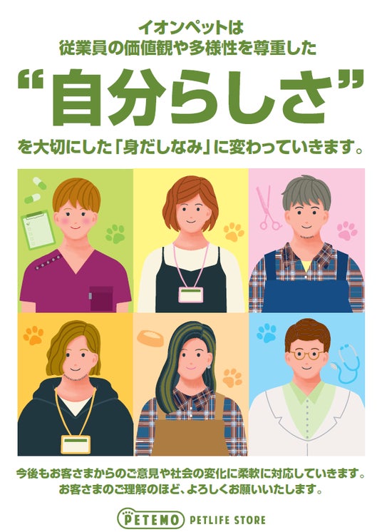 イオンペット株式会社(代表取締役社長:米津一郎、以下イオンペット)は、人財こそが最大の経営資源であるという考えのもと、従業員一人ひとりの多様な価値観を尊重し、誰もがいきいきと働ける職場環境を目指して、6月1日より従業員の身だしなみルールを原則自由化いたしました。