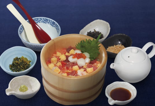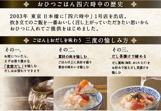 『おひつごはん四六時中』は、北海道産昆布と枕崎産鰹節の旨味が凝縮された特製だしを、先ずは「食前だし」でほっと一息できる瞬間を体験していただき、海鮮を中心とした「おひつごはん」を最後締めのだし茶漬けとして愉しめる、ごはんとおだしを味わうお店です。また豊富なトッピングを取り揃え、おひつごはんを自分好みにアレンジしても愉しめます。