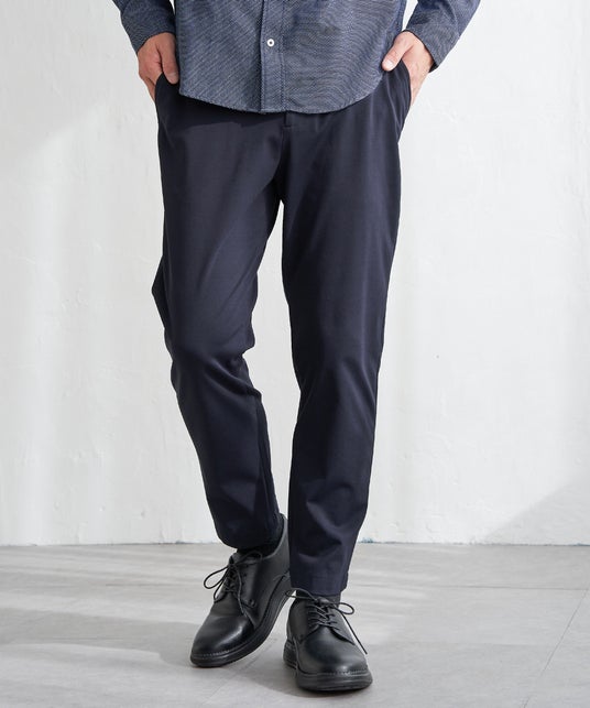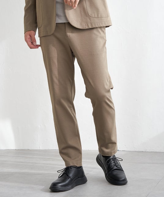 特 長:伸縮性と張り感を兼ね備えたジャージー素材。ウエストイージー仕様のテーパードシルエット。ジャストレングスで、足元スッキリ見え。シワにもなりにくく、幅広いシーンで大活躍。