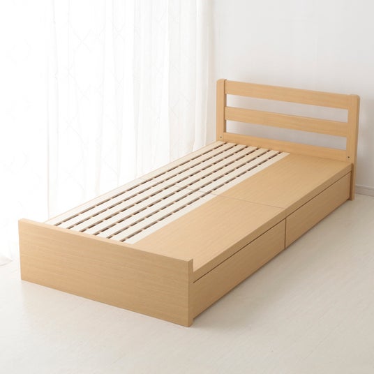 ベッド下に引き出しを付けて、収納スペースを確保した収納引き出しタイプのベッドです。引き出しは、奥まで引き出しやすいフルスライドレールを使用しています。収納庫に衣料やタオルを入れることで、お部屋の収納スペースを拡大できます。また、床板には通気性の良いスノコを使用しています。