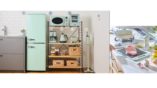 統一感のあるカラーでコーディネートでき、暮らしの気分を上げる各メーカーの家電を取り揃えます。今年は、レトロで可愛らしいミントグリーンで揃えられる、冷蔵庫やトースター、電気ケトルなど、新生活におすすめの調理家電やお掃除家電を8点セットでご用意します。