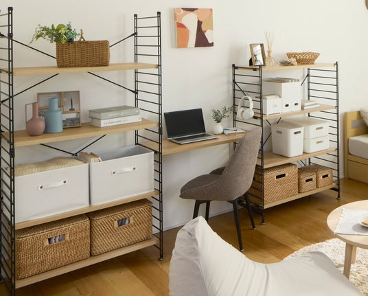 棚の高さが変えられるため、収納するものに合わせてスペースを有効活用できます。棚板耐荷重は25kgで電子レンジを置くことも可能です。2台並べて棚を付ければ、机としても使えるため、壁面を有効に使うことができます。