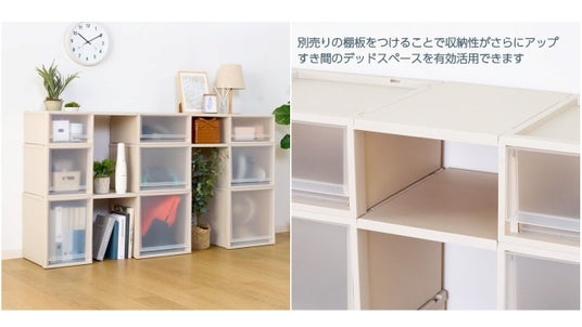 クローゼットやお部屋のスペースに合わせて6種類のサイズを組み合わせ、自由に積み重ねできる引出しケースです。別売りの連結棚をのせることでオープンシェルフとしても使用できます。積み重ねた状態で引出しを引いた時に、前方へ倒れてしまうことを防ぐ前倒れ防止機能付きです。