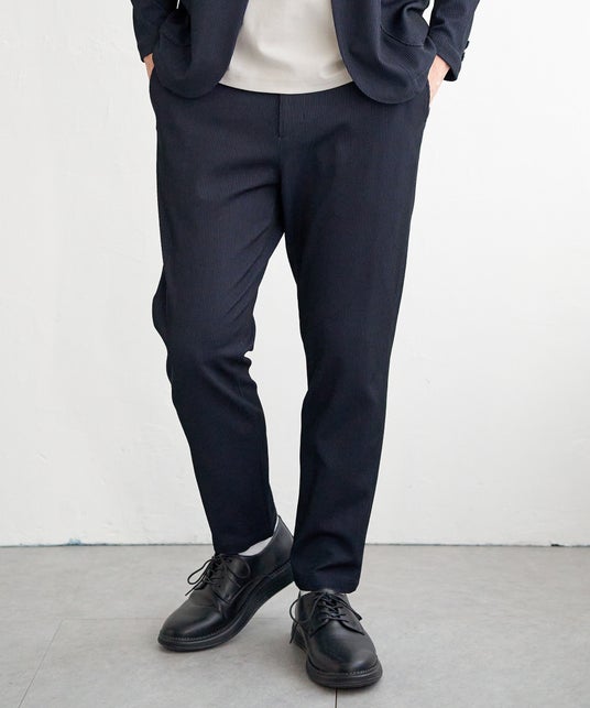 特 長:伸縮性抜群のサッカージャージー素材。裾はクッションの無いジャスト丈です。前身頃にゴムシャーリングが見えない、オン・オフ兼用のイージーパンツ。