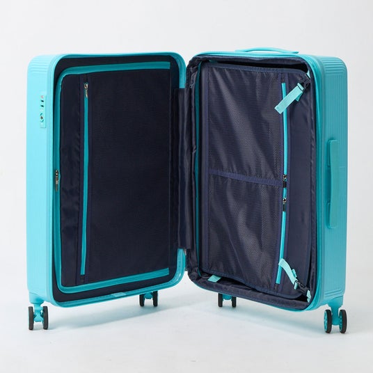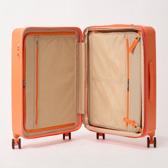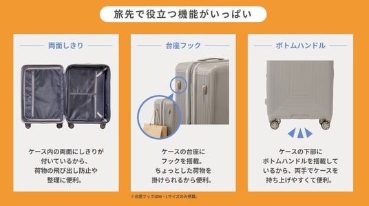 大型連休を中心にこれからの旅行や出張に向けて、今年はブラック、ネイビー、ホワイト、グレーのベーシックカラーに、サックスブルーとオレンジのキーカラーを加えたカラフルな6色展開のキャリーケースを販売します。さらに内装にもこだわり、ケースを開けても楽しめるように外側とカラーリングを合わせています。