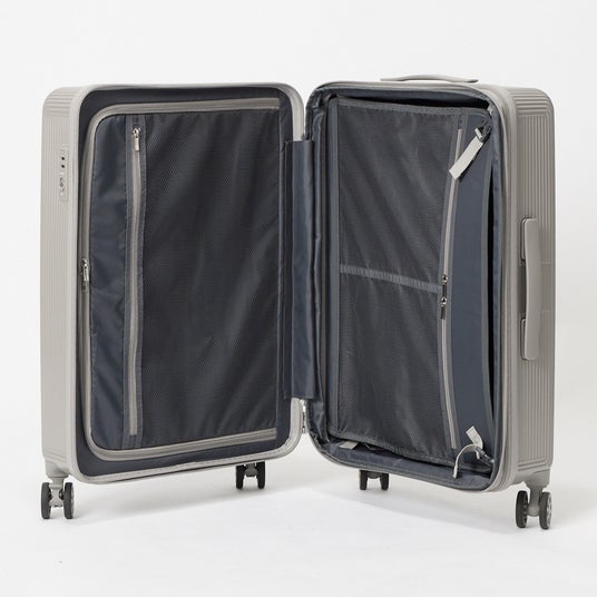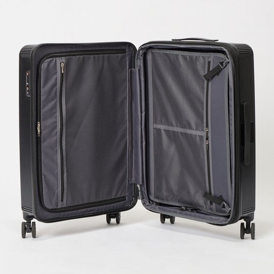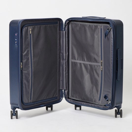 内装は、ファスナーポケット付きの両面仕切り仕様で荷物の整理に便利です。また、両手でケースを持ち上げやすいように、ケース下部にボトムハンドルを搭載しています。
