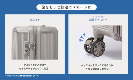 また、キャスターをロックできるので、揺れる電車内などで不意な動きに対応できます。