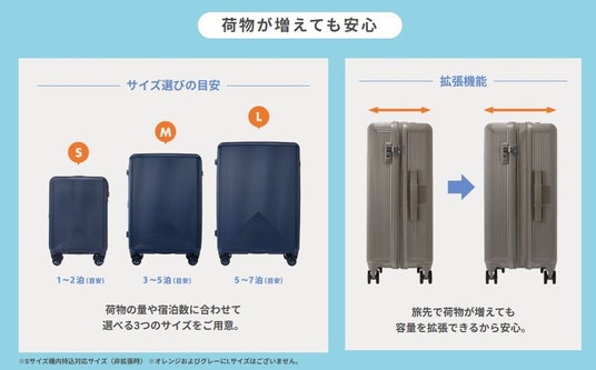 荷物の量や宿泊数に合わせて、選べる3サイズを展開します。本体外装のファスナーを開けることで奥行きを拡張することができます。