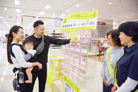 同年10月11日、イオン・デーに実施する取り組みの一つとしてスタートした「イオン 幸せの黄色いレシートキャンペーン」は、この日に発行される黄色いレシートを応援したい団体のボックスに投函いただくと、レシート合計金額の1%相当の品物をイオンが各団体に寄贈するもので、地域の活性化に貢献している団体と、その団体を「応援したい」というお客さまの気持ちを、イオンがつなぐ活動です。2001年10月から2024年2月までに、累計で約45万の団体さまに約51億円相当の品物を贈呈しています。