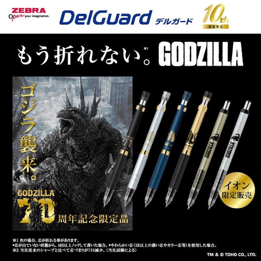 <ゴジラ70周年記念>ゼブラの“折れない※1)シャープペンシル”デルガードから、歴代のゴジラのシルエットをデザインしたプレミアムモデルをイオン限定発売