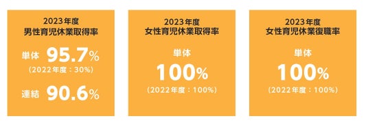 フォーバルでは、男性が育児に積極的に参加できるよう、休業制度の充実を図り、ワーク・ライフ・バランスの取れた働き方ができる職場環境を整えてきました。これまで男性の育児休業取得率が低いことがネックとなっていましたが、子どもが生まれた男性社員に対して育児休業取得を促す案内を送るなど、積極的な育休推進活動に取り組んできました。その結果、2023年度の男性育児休業取得率は95.7%と政府目標を大きく上回る成果を達成することができました。今後も働きやすい職場環境づくりを目指して、認定が継続できるよう取り組んでまいります。