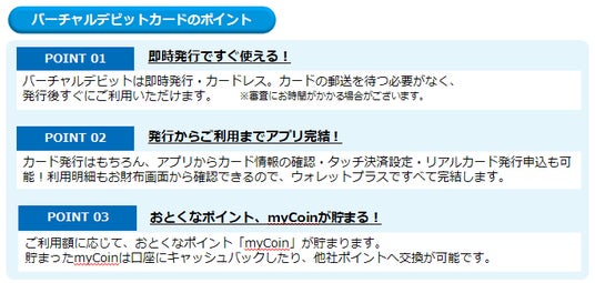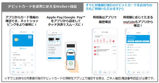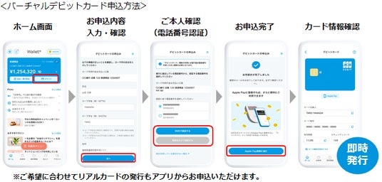 従来、ウォレットプラスでのデビットカードの利用明細表示や、ApplePay/Google Pay(TM)登録など、デビットカードをより便利にお使いいただける機能を提供してまいりましたが、本サービスにより提携銀行のデビットカードをお持ちでない方にもカードレスのバーチャルデビットカードを新規申込いただけるようになり、新規申込からご利用までスマホ1つで完結できるようになりました。
