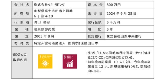 当行は、本商品の提供により、お客さまの多様な資金調達ニーズに対応するとともに、SDGsに資す る取組みを支援し、持続可能な地域社会づくりや地域貢献活動に積極的に取り組んでまいります。