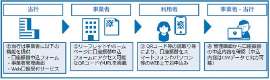 本サービスは、口座振替をお申し込みいただく預金者(以下「利用者」といいます)と口座振替の収納委託者である事業者(以下「事業者」といいます)との口座振替のお手続きを、スマートフォンやパソコン等のWEB上で完結できるものです。