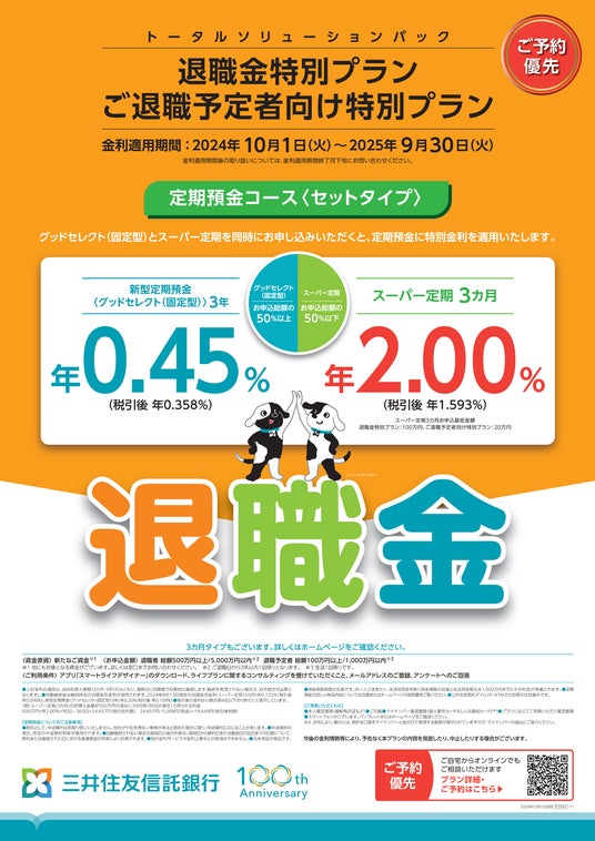 三井住友信託銀行株式会社(以下「当社」)は、2024年10月1日より「退職金特別プラン」「ご退職予定者向け特別プラン」(以下「当プラン」)をリニューアルし、定期預金金利を一部引き上げの他、利用可能期間を延長しました。