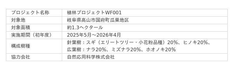 株式会社ウッドフレンズ(本社:愛知県名古屋市、代表取締役社長:伊藤 嘉浩、以下「当社」)は、2025年6月6日に、岐阜県高山市国府町の自社林において、植林プロジェクトの第1号となる「植林プロジェクトWF001」を始動しました。本プロジェクトでは、都市と森林を双方向につなぐ新しい関係性の構築を目指しながら、未利用山林の活用と森林環境の再生に取り組みます