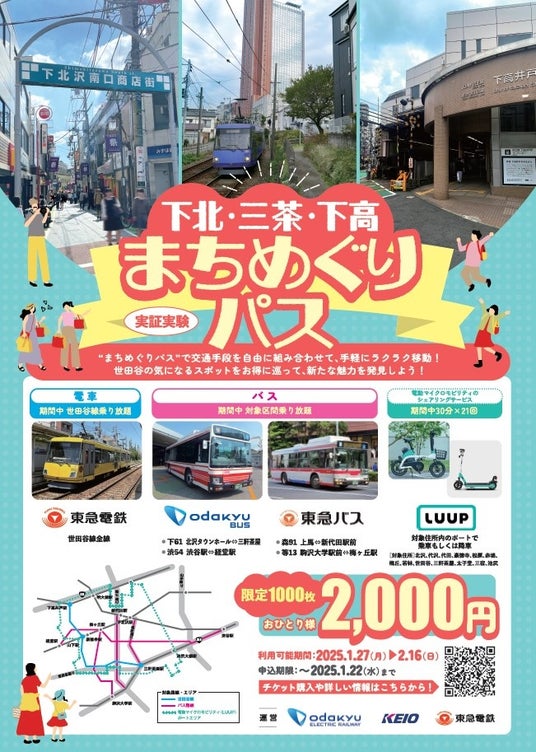 小田急電鉄株式会社、京王電鉄株式会社、東急電鉄株式会社は、3社の路線が近接する世田谷エリア内のさらなる活性化に向けた実証実験として、複数のモビリティでエリア内を回遊できるデジタルパス「下北・三茶・下高まちめぐりパス」(以下、本デジタルパス)を2025年1月8日(水)から1月22日(水)までの間、1,000枚限定、税込2,000円で先着販売します。