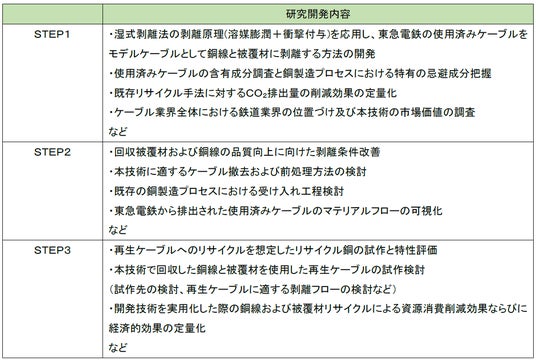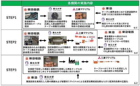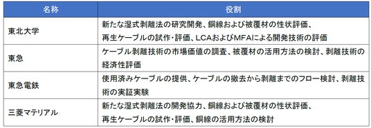 本研究開発は、被覆線の湿式剥離法に関する研究・技術開発を先導してきた東北大学、脱炭素・循環型社会の実現に向け2022年3月に「環境ビジョン2030」を策定し、2030年までに廃棄物量10%削減を目指す東急、鉄道事業を通じて脱炭素・循環型社会の実現に向け、事業特性を活用した新たな価値創造・貢献などにより環境・社会課題の解決を目指す東急電鉄、銅をはじめとする非鉄金属の高度な製錬およびリサイクル技術を有する三菱マテリアルの、4者連携により実現しました。