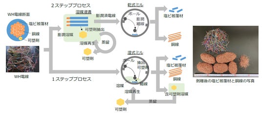 東北大学ではこれまでに、自動車由来のワイヤーハーネスに使用されている細い電線を対象に、湿式剥離法を開発してきました。ワイヤーハーネス(WH)に使用されているケーブルの被覆材には主にポリ塩化ビニルが使用されています。本技術では、被覆材を適切な有機溶媒かつ適切な条件下において浸漬することで膨潤させ、銅線と被覆材の間に隙間を形成します。続いて、膨潤したケーブルに対して、ボールミルなどにより適切な衝撃力を与えることで、銅線および被覆材の過度な破砕を抑制しながら銅線と被覆材を高精度に剥離することが可能になります。湿式剥離法はこれまでに、膨潤処理後に乾式ミルにより剥離する2ステッププロセス、膨潤と剥離を湿式ミルにより同時に行う1ステッププロセス、の2種類のプロセスを確立しています。本技術により回収された銅線および被覆材には、それぞれの破砕物の混入が抑制されるため、回収される銅の高品位化、回収された被覆材のリサイクル活用が期待できます。