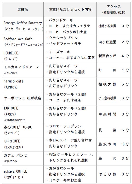 対象の11店舗は、小田急線各駅のグルメやお出かけ情報等をまとめた沿線広報誌「ODAKYU VOICE home」で紹介したカフェのうち、世田谷~湘南~多摩エリアから選定、それぞれ各駅から徒歩数分でアクセスいただけます。いずれも座席数が多くゆったりお過ごしいただけ、旬のフルーツをふんだんに使ったタルトが自慢のお店や、製法が異なるチーズケーキから選べるお店、世界大会で優勝経験のあるバリスタによるコーヒーとスイーツが味わえるお店など、幅広くご用意しています。