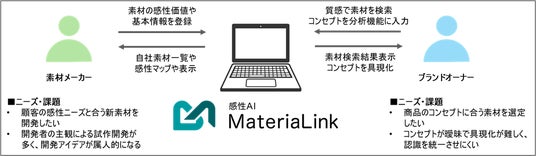 この度、2023年にβ版の提供を開始した「感性マテリアルプラットフォーム」の一部機能をリニューアルし、「感性AI MateriaLink」と改称した上で、製品版として提供を開始します。本サービスは、主観的で曖昧な感性を定量化し、素材の開発や探索をすることで、より人間中心設計のプロダクトの創造に寄与し、ビジネスにおける協創を促しながらイノベーションの創出を目指す素材のプラットフォームです。素材の触り心地を定量化・可視化し、データベース化することで、感性価値を重視した素材メーカーの素材開発や、ブランドオーナーの素材の探索をサポートします。