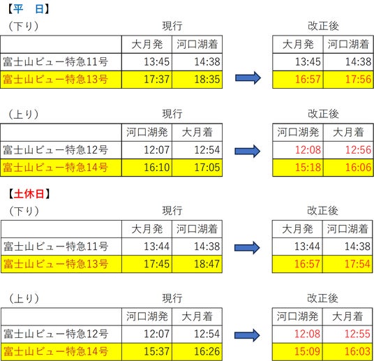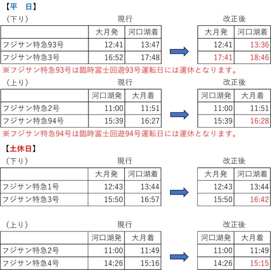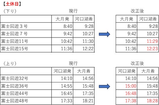河口湖発始発列車の時刻を繰り上げ、大月駅にて平日運行のJR中央線上り臨時特急「かいじ70号」へ接続します。これにより、富士山エリアから都内への通勤や観光などの早朝の移動が便利になります。