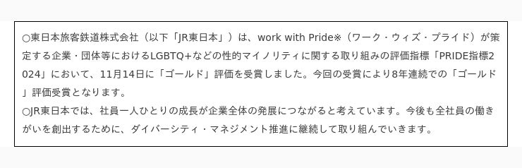 このたび、JR東日本におけるLGBTQ+の社員への理解に向けた取り組みが評価され、「PRIDE指標」において「ゴールド」評価を8年連続で受賞しました。JR東日本は、「JR東日本グループレポート2024」において、DE&Iの推進を掲げています。その一つとして、LGBTQ+の社員への理解にむけて、3つの柱で取り組んでいます。