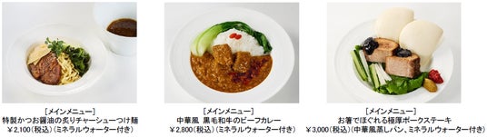 かつお出汁を効かせた特製醤油ダレに熱海で長年愛されるコマツ屋製麺の平打ち麺をあわせた「特製かつお醤油の炙りチャーシューつけ麺」、野菜の優しい旨みに特製ラー油を添えた「中華風 黒毛和牛のビーフカレー」、蒸しパンが付いたボリューム満点の「お箸でほぐれる極厚ポークステーキ」をご用意しました。