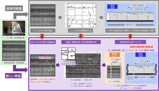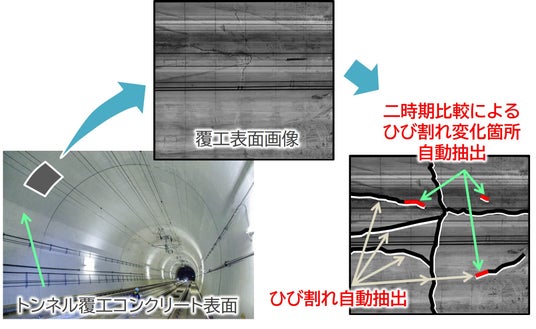 トンネルでは、覆工(ふっこう)コンクリートの表面(以下、覆工表面)に現れるひび割れなどに着目して検査を行っているため、今回、新幹線トンネル覆工表面画像に最適化した「ひび割れを自動抽出する技術」と、「二時期のひび割れを比較する技術」を新しく開発しました。これらは、人が実施していたひび割れの抽出、及び二時期比較による変化箇所・変化量の抽出を自動化するもので、これらの技術を組み合わせた新幹線トンネル検査のDXを日本で初めて実現いたしました。