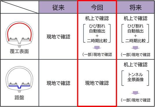 (2)覆工表面画像には路盤が含まれていないため、今後、路盤も含めたトンネル全景画像を取得する装置を開発します。これにより、覆工から路盤まで画像で確認・検査が可能な仕組みを整備していきます。