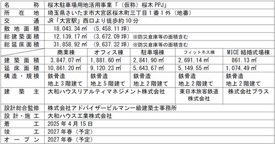 大和ハウス工業株式会社(本社:大阪市北区、代表取締役社長:大友 浩嗣)と大和ハウスリアルティマネジメント株式会社(本社:東京都千代田区、代表取締役社長:伊藤 光博)(以下「大和ハウスグループ」)、東日本旅客鉄道株式会社(本社:東京都渋谷区、代表取締役社長:喜㔟 陽一)(以下「JR東日本」)の3社は、埼玉県さいたま市大宮駅西口において、桜木駐車場用地活用事業「(仮称)桜木PPJ」(以下「本プロジェクト」)を4月15日に着工しました。