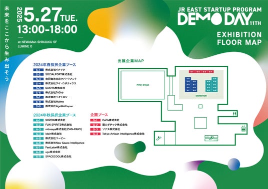 この度開催する「第11回JR東日本スタートアッププログラムDEMODAY」は、プログラム2024秋の採択企業が新たな共創プランを発表する「PITCH STAGE」(プレゼンテーション)、そしてプログラム2024秋の採択企業に加えOBOG企業の事業共創の数々を展示・紹介する「EXHIBITION」(ブース展示)を催します。