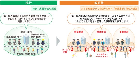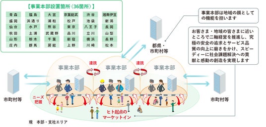これまでの2本部・10支社から、それぞれの地域のマーケットやお客さまのご利用状況などを踏まえた36の事業本部での事業運営体制に改正します。