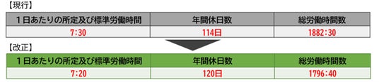 事業運営体制の改正を踏まえ、職種ごとに異なっていた労働時間・休日数を統一のうえ、年間の所定労働時間を短縮します。