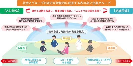 事業運営体制の改正にあわせ、今後は社員が様々なフィールドの業務を担い、仕事を通じた気付きや発意を起点に、お客さまや地域の皆様のニーズに応え感動を創造、お客さまの心に寄り添った質の高いサービスを提供してまいります。また、グループ会社間の垣根を越えた人材の行き来を一層活発化させ、グループ経営を担う人材を育成していきます。