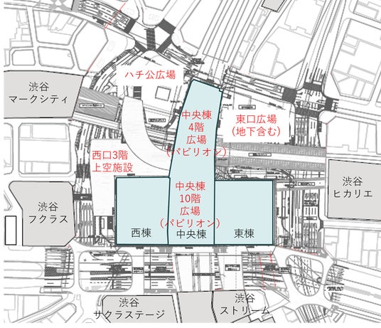 上記の他、2034年度までには、「ハチ公広場」「東口地上広場」「中央棟4階広場(JR線路上空)(仮称)」「西口3階上空施設(仮称)」「中央棟10階広場(仮称)」の計約20,000平方メートル の5つの多様な広場空間も誕生します。この広場空間は、世界有数の大規模ターミナル駅である渋谷駅直近に位置し、非常時の一時避難場所としての機能をもち、にぎやかな渋谷のまちに居ながら、“憩い・潤い・リラックス”も感じていただけるような、みなさまに愛される広場になることを期待しています。
