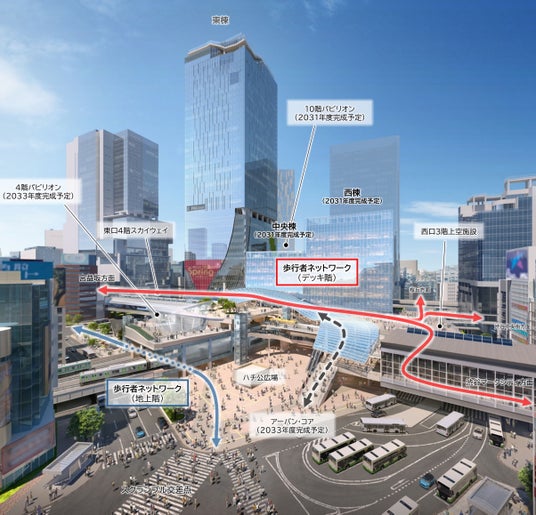 ●ハチ公広場などを含めた全体の完成は2034年度を予定しております。工事期間中はご不便・ご迷惑をおかけしますが、工事の情報発信を継続的に行い、ご利用者の安全を最優先に大規模ターミナル駅としての機能を保ちながら、段階的なより良いまちづくりを推進していきます。