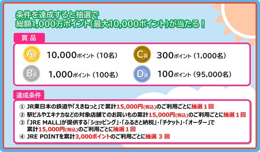 JR東日本の鉄道や「えきねっと」で累計15,000円(税込)のご利用ごとに抽選1回