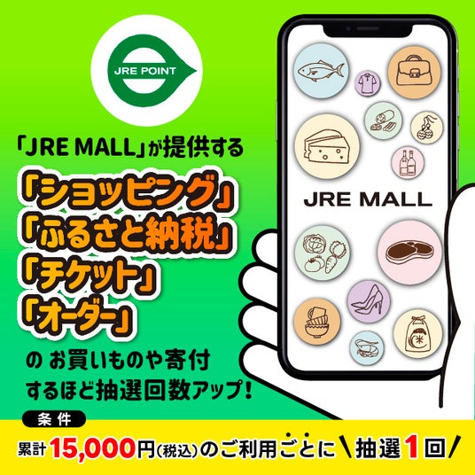 「JRE MALL」が提供する「ショッピング」・「ふるさと納税」・「チケット」・「オーダー」で累計15,000円(税込)のご利用ごとに抽選1回