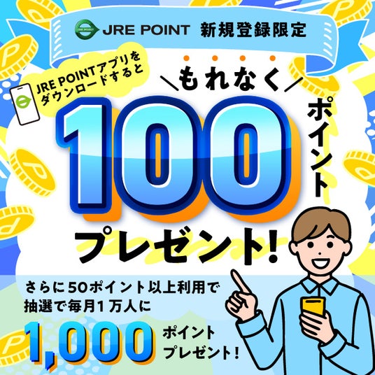 ○さらに、JRE POINTに新規登録してJRE POINTアプリをダウンロードのうえ初回ログインいただいた方に、もれなく100ポイントをプレゼントします。獲得したポイントを利用して抽選に参加しましょう!
