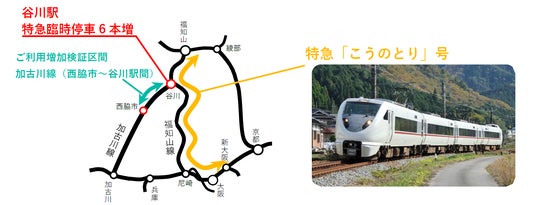 福知山線 谷川駅で対向列車の待ち合わせのために停車している一部の特急「こうのとり」号について、通常はお客様の乗り降りができませんが、お客様に乗り降りしていただけるよう取り扱いを変更する実証実験を行っており、このたび実施期間を延長いたします。