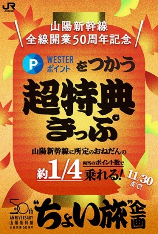 ご好評につき、再登場!山陽新幹線全線開業50周年記念 “ちょい旅”企画 この秋も「WESTERポイント超特典きっぷ」を発売します