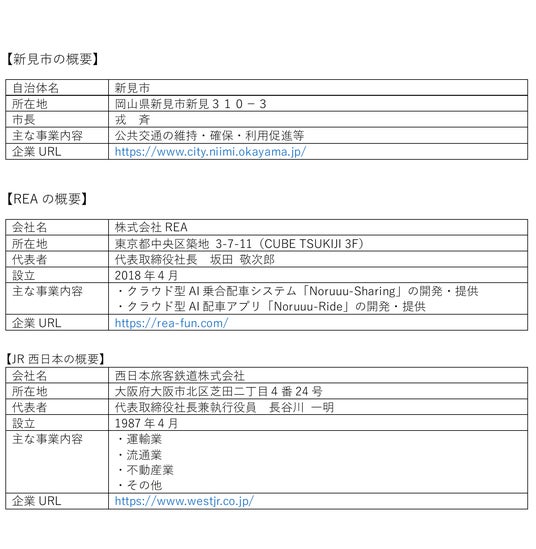 岡山県新見市では、市内4地域において電話予約による乗合タクシーを運行しております。このたび、新たにAIを活用した配車予約サービスを開始するとともにWESTER及びWEBでの予約を開始します(※1)。また、哲多地域及び新見南西部地域(井倉・法曽・草間の一部)においては同サービスを活用し、初めて乗合タクシーを導入します。
