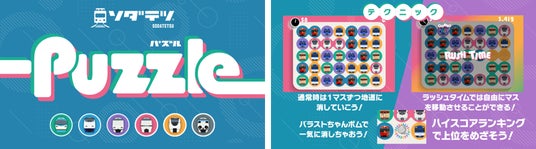 ソダテツ内に新作ミニゲーム「ソダテツパズル」が登場します。列車のアイコンを縦ならびもしくは横ならびに3つ以上揃えると、列車のアイコンが消え、スコアを獲得することができます。