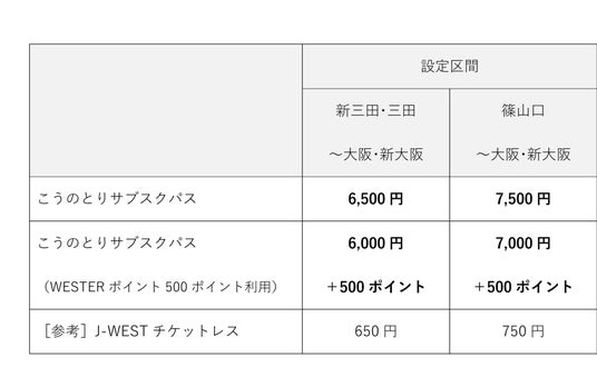 ・輸送障害等により予告なく「こうのとりサブスクパス」の発売を終了する場合がございます。