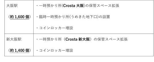 大阪駅および新大阪駅では、手荷物預かり機能として現在約4,000個の容量を有しておりますが繁忙期には不足することがあります。今回、さらに最大約3,000個の容量拡大を行うことで、合計7,000個の容量を確保し、預かり機能の強化を図ります。